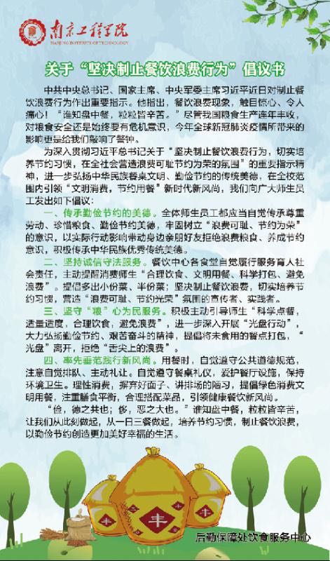 新学期第一天,师生们走进食堂,映入眼帘的是餐桌和立柱上张贴的倡议书。倡议书号召全体师生员工积极响应号召,牢固树立“浪费可耻,节约为荣”的意识,弘扬中华民族自古以来文明有礼、节俭惜福、珍爱粮食的优良美德;争做“光盘行动”的践行者,从现在做起,从身边做起,从一日三餐做起,理性消费,按需点餐,提倡将未食用完的餐点打包,“光盘”离开,拒绝餐桌上的浪费。同时倡议各餐饮窗口要注重膳食平衡,合理搭配菜品,考虑不同层次的需求,多制售小份菜、半份菜,积极主动引导师生合理购餐,在保证营养均衡的同时减少浪费。