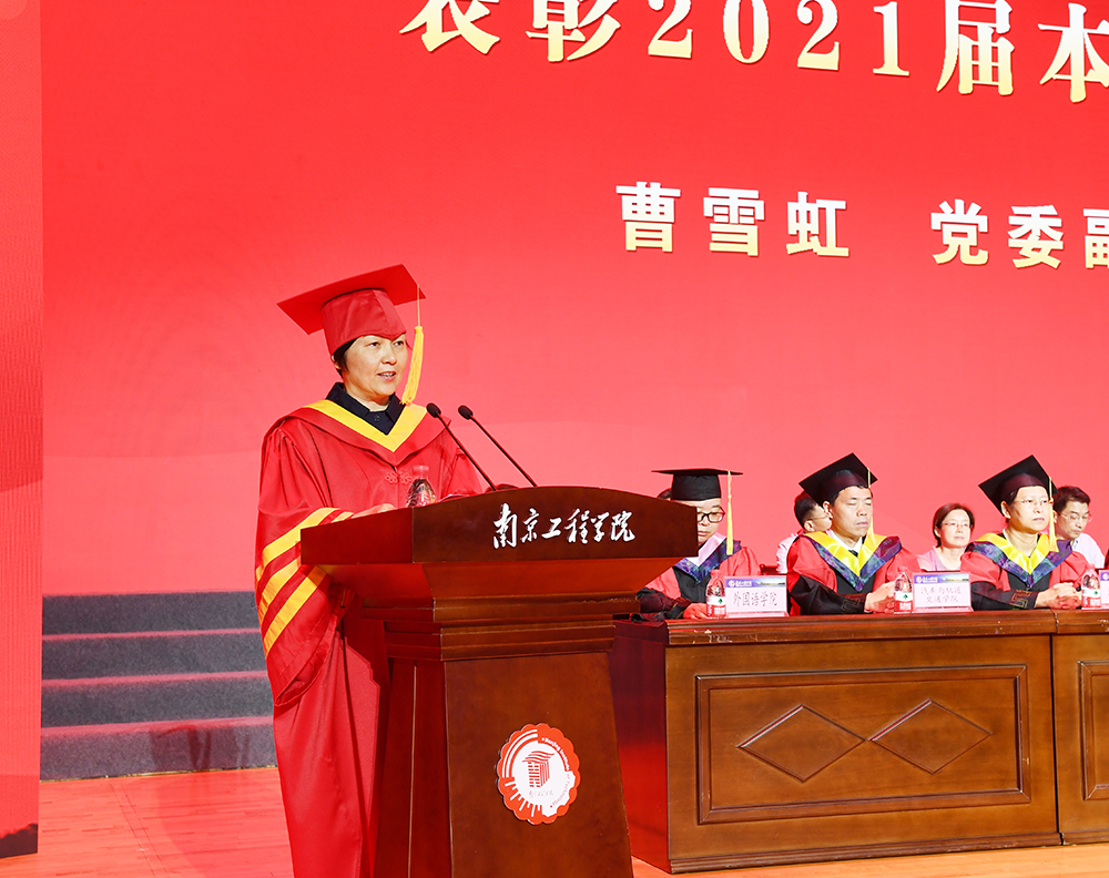 校党委副书记、副院长曹雪虹宣读了优秀毕业生表彰决定。在我校2021届毕业生中,有2万多人次获校级及以上各级各类奖项。其中,涌现出省级先进集体12个,省级三好学生、优秀学生干部36名,省优秀毕业生11名;校三好学生标兵16名、三好学生409名、优秀学生干部385名。截止目前就业率达87.48%,其中到世界500强及其他行业龙头企业等高质量单位就业占比超过70%,有1000多名学生考取了硕士研究生。