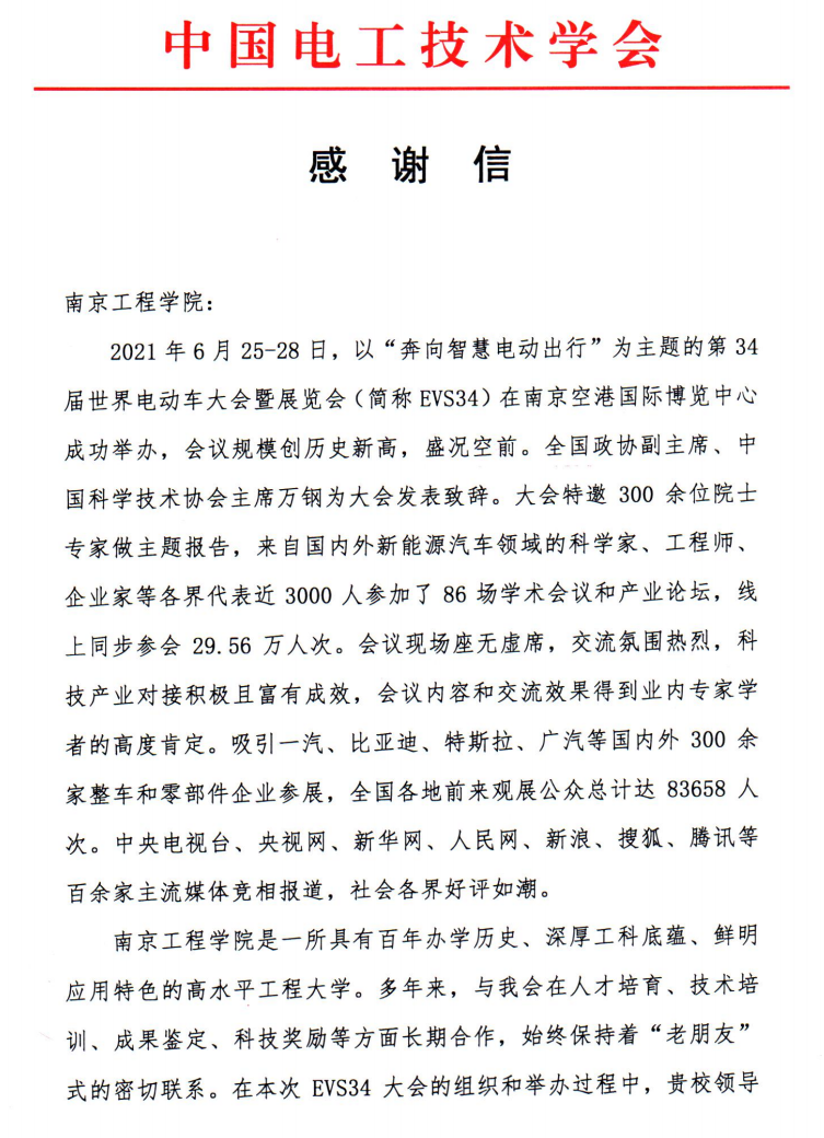 由世界电动车协会(WEVA)、亚太电动车协会、南京市人民政府和中国电工技术学会共同举办的第三十四届世界电动车大会暨展览会于6月底在南京落下帷幕,全国政协副主席、中国科协主席万钢为大会致辞,300余位院士专家做主题报告,近3000人参加线下学术会议及论坛,8万多人前来观展。我校电气工程专业100名研究生同学连续5天承担了这场盛会的志愿服务工作,以优质的服务和良好的精神面貌赢得了主办方和参会者的一致好评,日前,中国电工技术学会专门发函至凯发表示感谢。