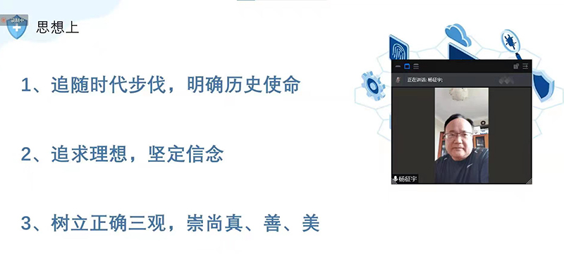 分享战“疫”志愿者故事、感受时代思想伟力、防疫安全指导、线上学习方法交流………8月18日,软件201班“第二班主任”、校党委常委、副院长杨征宇老师走进软件201班以“力行担当,与时代同行”为主题的云端班会,将疫情防控和思想政治教育相结合,希望班级同学们为打赢这场疫情阻击战力行担当,同时为特殊开学季做好准备。