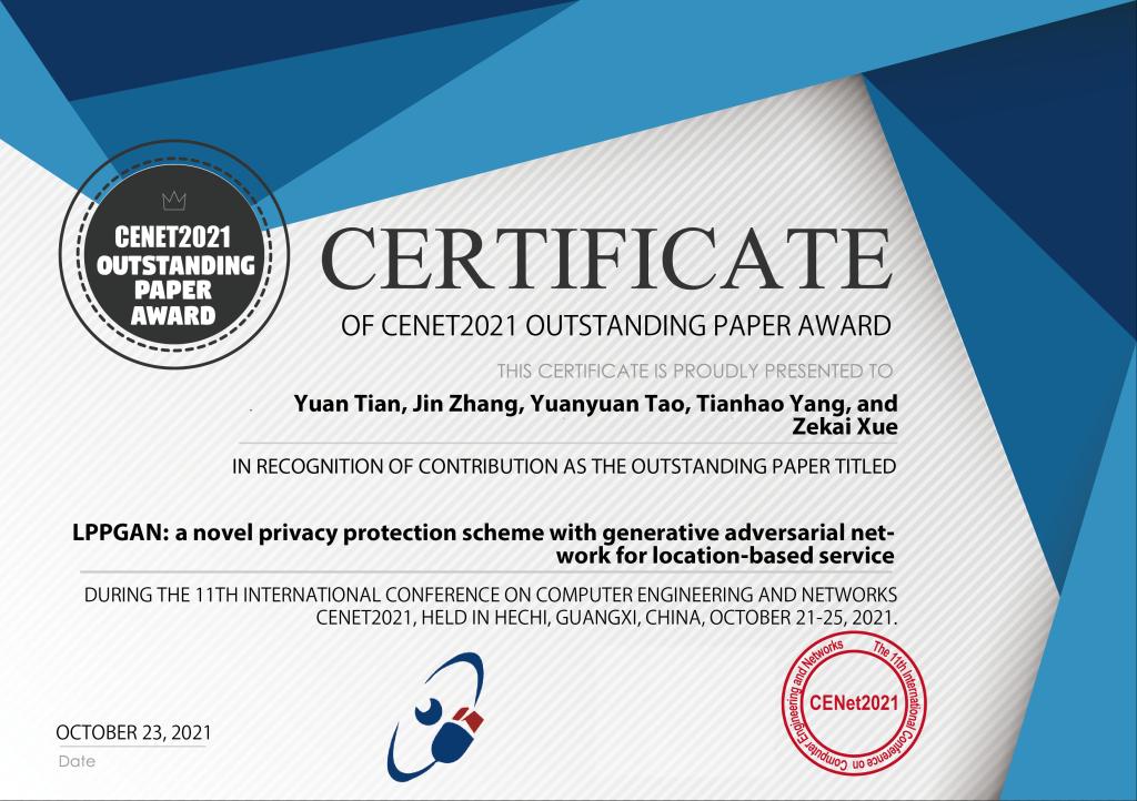 10月21日—25日,第十一届计算机工程与网络国际会议(International Conference on Computer Engineering and Networks)在中国河池举行。由我校计算机凯发教师田源副教授与国际教育学院本科学生张瑾等人合作撰写的论文“LPPGAN: a novel privacy protection scheme with generative adversarial network for location-based service”,得到CENet审稿人和评奖委员会的一致好评,获得本次大会的最佳论文奖。
