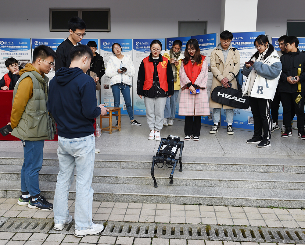 本次成果展主会场还特别展示了仿生四足机器人、韩博士科教机器人、水下机器人、越野机器人、空中机器人、智能轮椅等创新创业作品。特别是场上的三台仿生四足机器人形如一群活泼好动的大狗吸引了所有在场师生的目光,对其智能化的设计赞不绝口。韩博士科教机器人也深受在场师生的欢迎,纷纷与其拍照合影。