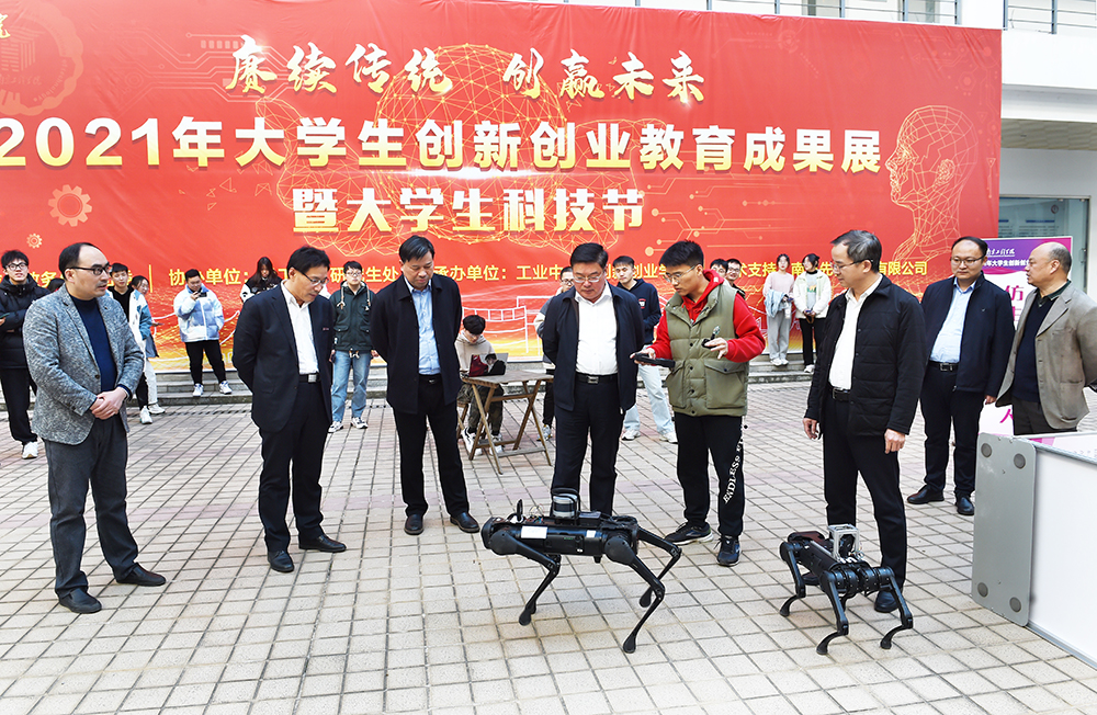 在仿生四足机器人展台,校领导们对其智能化设计、灵活自如的动作形态表示出浓厚的兴趣,对其运用前景充满期待。在水下机器人、垃圾智能分类装置、方程式赛车、污水净化处理等作品展台前,他们认真听取同学们对作品的介绍和展演,对作品给予高度评价,同时希望项目团队以此为起点,再接再厉,希望他们在创新创业的道路上再创佳绩,取得更加丰硕的成果。史国君书记还特别关注了创新创业优秀导师的展板,对每一位导师做出的贡献、取得的成果给予高度肯定和赞扬。