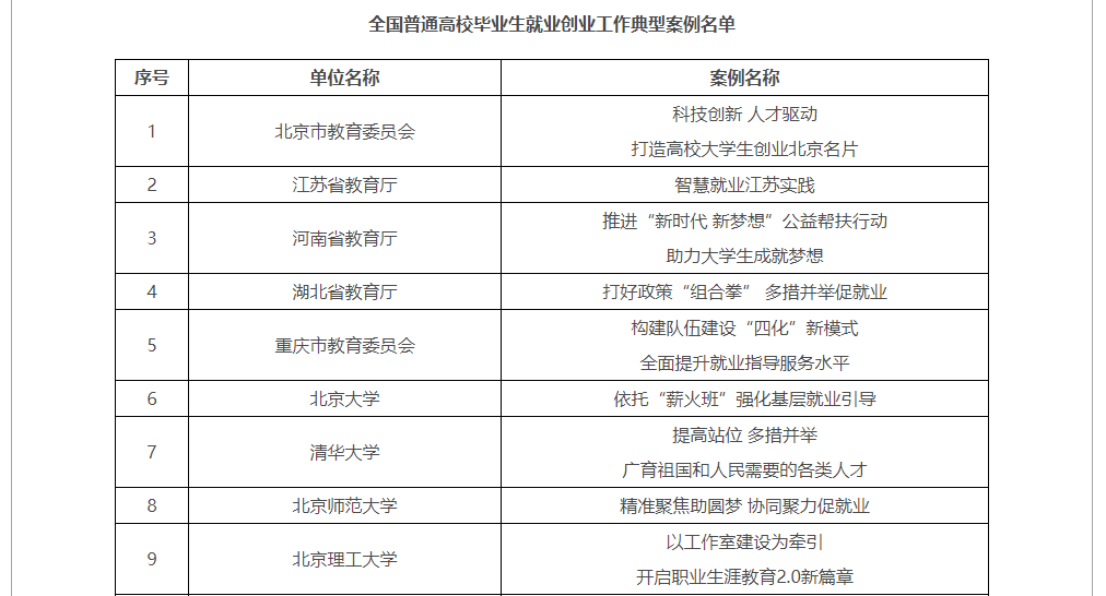 为总结推广各地各高校和有关单位在高校毕业生就业创业工作中探索形成的好做法、好机制、好经验,教育部开展了全国普通高校毕业生就业创业工作典型案例总结宣传工作。经各地各高校申报推荐,专家择优遴选,确定了100个典型案例。我校经省教育厅选送推荐的《突出“三用” 彰显“三热” 全力推进新时代高校征兵工作》案例成功入选,教育部将通过中国教育报等媒体专题宣传、高等教育出版社结集出版、巡讲分享会等多种形式进行宣传推介。