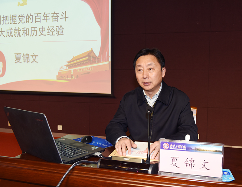 12月9日下午,我校在至勤楼·行政中心多功能厅举行学习贯彻党的十九届六中全会精神宣讲团报告会,省社科院党委书记、院长夏锦文作宣讲报告。报告会由我校党委书记史国君主持。全体校领导、中层干部、党员师生代表等200余人聆听报告。