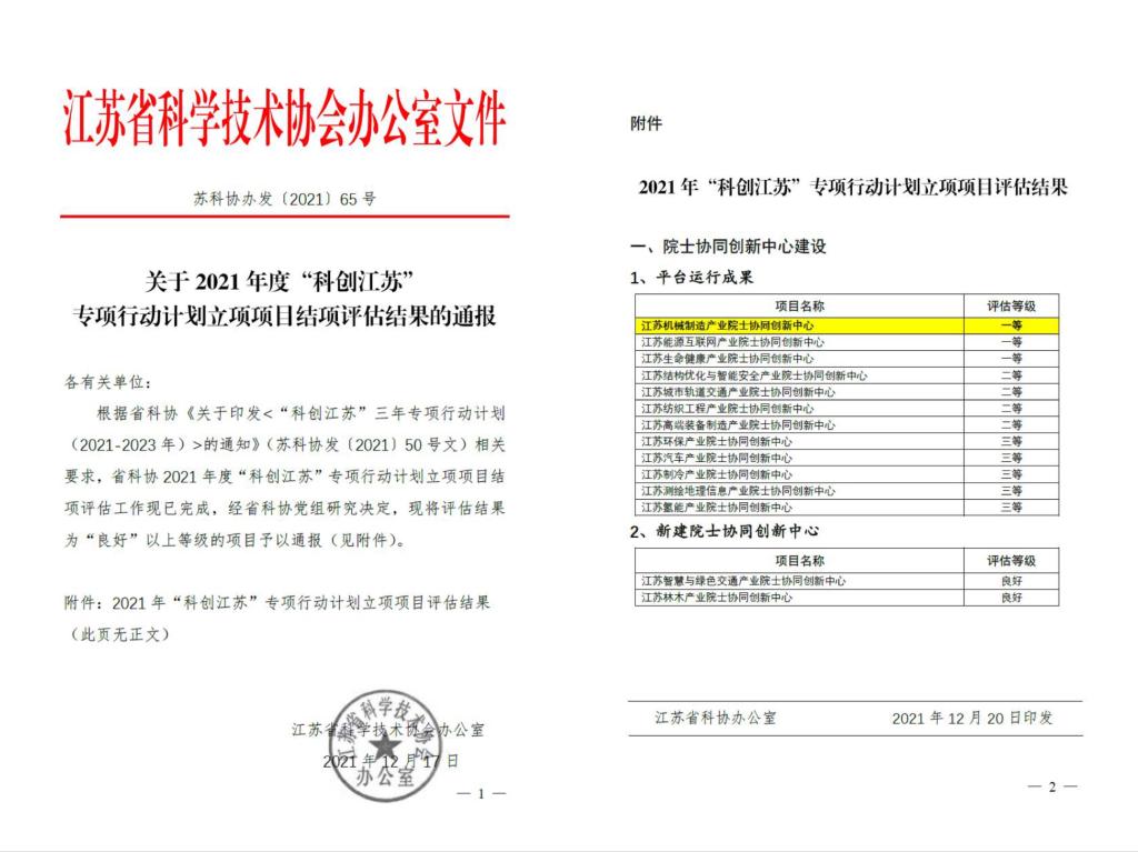 12月21日,江苏省科协发布了2021年“科创江苏”专项行动计划立项项目评估结果,由我校支撑和运营的“江苏机械制造产业院士协同创新中心”获评2021年度评估考核第一等次。全省共有17个院士协同创新中心参加了评估考核,其中3个获评第一等次。这也是中心自2020年成立以来连续两年获评第一等次。