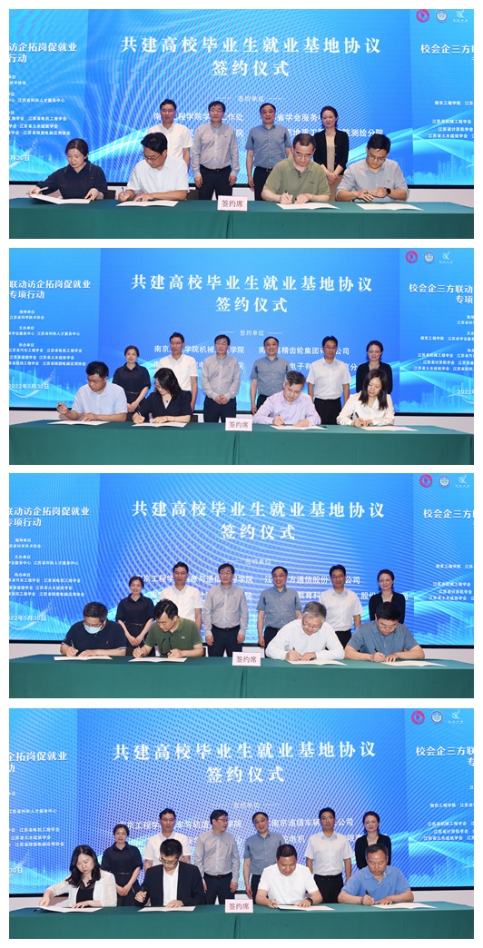 活动中,学生工作处、机械凯发、电力凯发、信息与通信凯发、计算机凯发、建筑凯发、汽车与轨道交通学院、工业中心负责人分别与江苏省学会服务中心、南京高精齿轮集团有限公司、常州是为电子有限公司南京分公司、江苏十方通信股份有限公司、国信蓝桥教育科技(杭州)股份有限公司、中车南京浦镇车辆有限公司、江苏南京地质工程勘察院、南京汽轮电机(集团)有限责任公司签订共建毕业生就业基地协议。