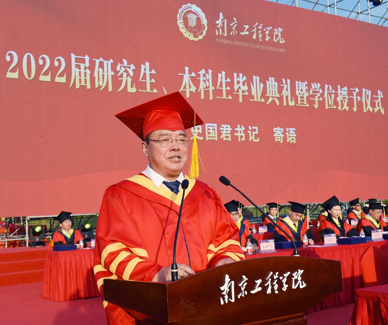 “临别之际,远行之前,作为老师,作为长辈,我想再次为大家鼓劲加油!”典礼最后,校党委书记史国君向毕业生们提出了三点希望作为临行锦囊。他期望同学们要以深厚家国情怀,书写报国之志,让青春在大有可为的时代里绽放人生光彩;要以闪耀责任之光,照亮担当之路,敢于在最艰苦、最困难、最需要的地方大显身手,用担当的姿态发出“请党放心,强国有我”最强音;要以笃行求实姿态,谱写青春华章,时刻提醒自己,把行胜于言作为青春的座右铭,去书写无愧于时代的壮丽篇章。