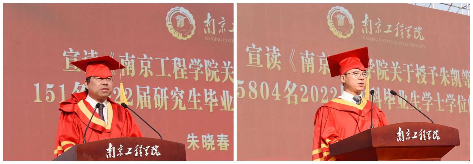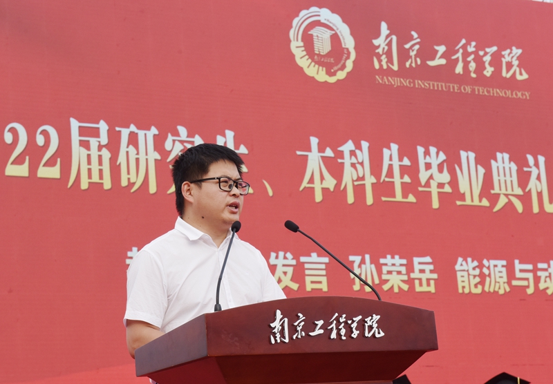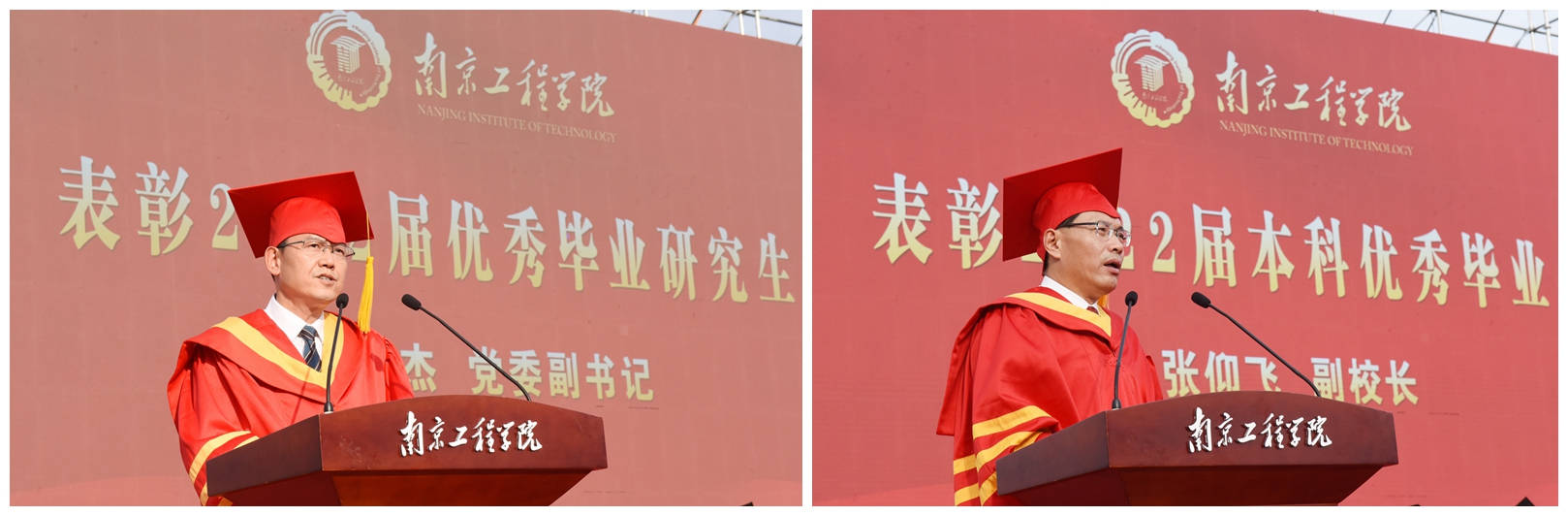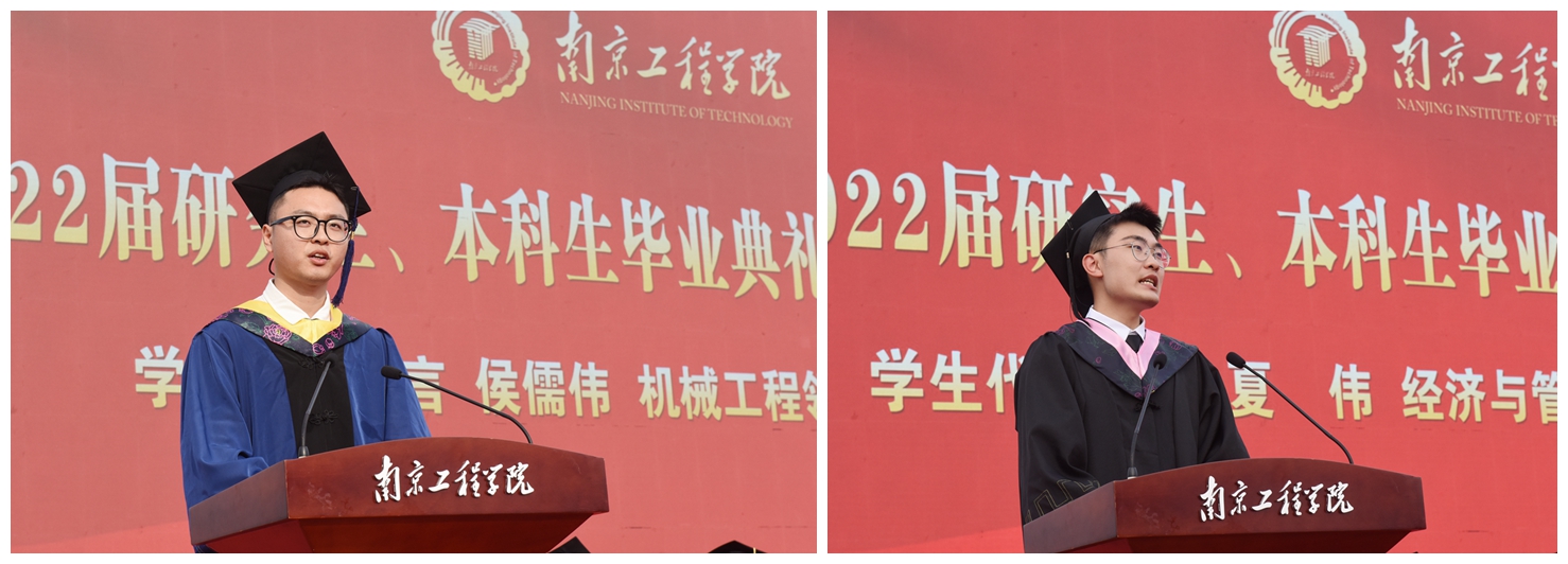 机械工程领域研1901班侯儒伟、经济与管理学院人力181班夏伟代表全体毕业生深情回顾了在南工程的求学经历,向精心培育自己的母校和老师、辛勤操劳的父母以及朝夕相处的同窗表达了衷心的感谢,并立志在青春的赛道上跑出南工程人的青春加速度,努力成为强国先锋,复兴栋梁。
