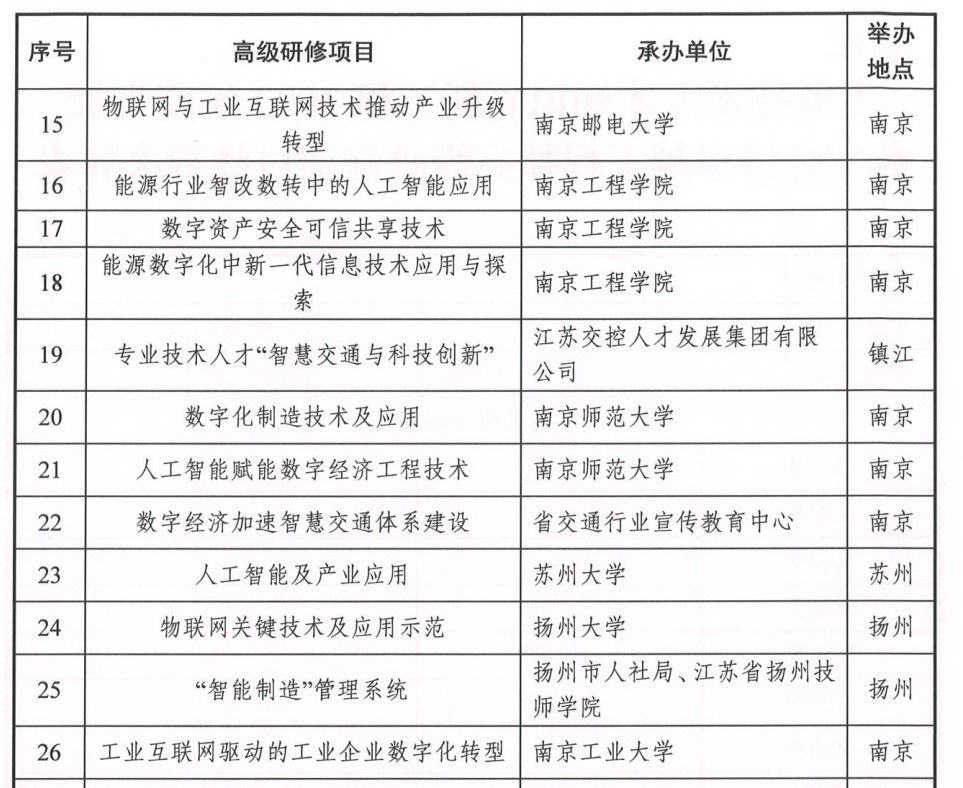 近日,江苏省人力资源和社会保障厅发布《关于印发专业技术人才知识更新工程2022年度省级数字经济卓越工程师高级研修项目计划的通知》(苏人社函〔2022〕414号),我校《能源数字化中新一代信息技术应用与探索》、《能源行业智改数转中的人工智能应用》、《数字资产安全可信共享技术》三个项目经组织申报、遴选等环节,成功入选省级财政资助培训项目。