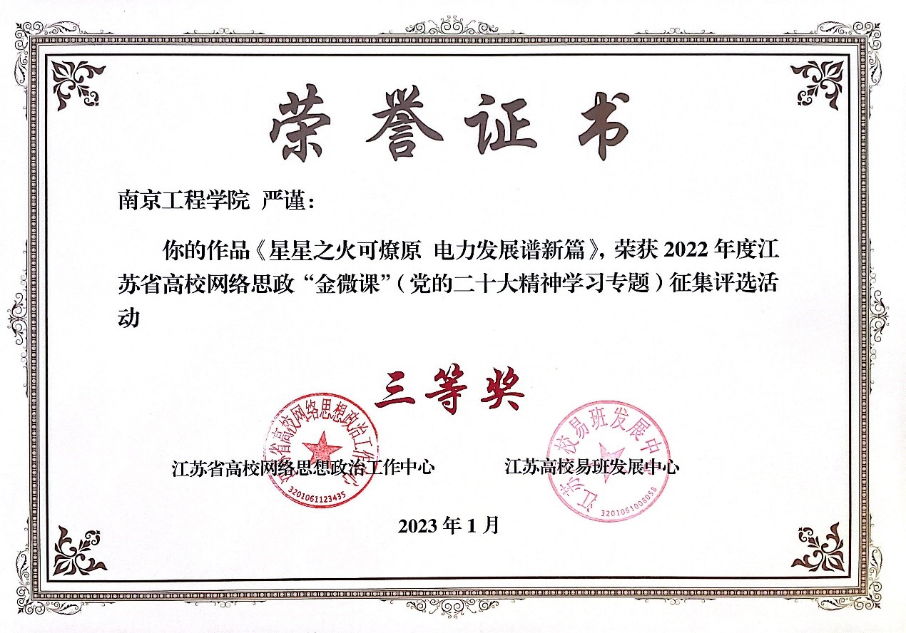 近日,由江苏省高校网络思想政治工作中心和高校易班发展中心主办,面向全省高校开展的网络思政“金微课”(党的二十大精神学习专题)征集评选结果公布,经高校推荐、材料审核、专家初审、作品内容审核、专家复审等环节,我校能源与动力凯发青年教师严谨的作品《星星之火可燎原 电力发展谱新篇》在全省94所高校推荐的168件作品中脱颖而出,荣获三等奖。