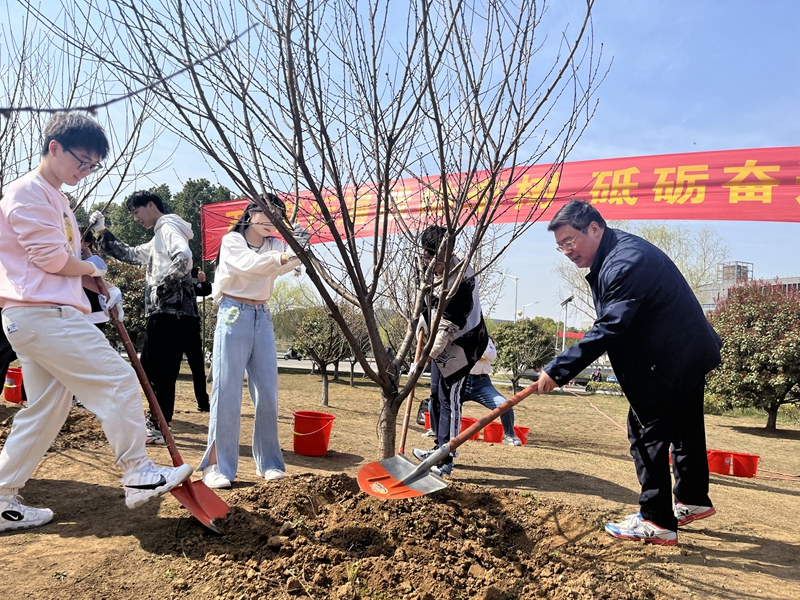 “每年这个时候,我们一起参加义务植树,不仅是为了建设我们的美丽校园,也是为了在全校特别是青年学生心中播撒生态文明的种子。”校党委书记史国君看着去年栽下的碧桃正茁壮成长,高兴不已。在后勤技术人员的指导下,参与植树的师生分工协作,干劲十足。大家整地挖坑、扶正树苗、挥锹培土、提水浇灌,各道工序有条不紊,现场一派热火朝天的劳动景象。史书记一边劳动,一边不时和周围学生交流,询问同学们的学习生活情况,叮嘱他们要德智体美劳全面发展,不能忽视“劳”的作用,培养劳动意识、环保意识、节约意识,不断锤炼自身意志品质,努力成长为党和人民需要的有用之才。植树间隙,史书记还与后勤相关负责人交谈,关心询问校园绿化、环境打造等情况。他说,绿色是高质量发展的底色,要贯彻落实“绿水青山就是金山银山”的生态发展理念,建立健全长效机制,不断加强校园生态文明建设,凝练传承优秀校园文化,为争创全国文明校园贡献力量。