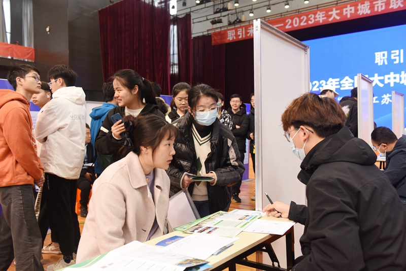 此次活动由人力资源和社会保障部全国人才流动中心、江苏省人力资源和社会保障厅、江苏省教育厅和我校主办,由江苏省人才市场和我校学生工作处承办,拉开了2023年大中城市联合招聘“创响江苏”数字经济专场招聘会的序幕。作为我校近三年来首次举办的大型校园招聘会,共邀请到300多家优质企业,提供了万余个岗位需求,吸引了南京航天航空大学、南京医科大学等兄弟院校众多毕业生前来应聘。杨刚基主任、顾潮副厅长和史国君书记一行与各省市人社部门、兄弟院校负责同志围绕高校毕业生就业形势、就业观念等进行了深入交流。在招聘展位前,领导们详细询问企业规模、岗位需求及人才储备情况,对用人单位表示欢迎和感谢;他们还与求职毕业生亲切交流,详细了解同学们的求职意愿和签约情况,鼓励毕业生抓住机遇,尽快找到适合自己的工作岗位。